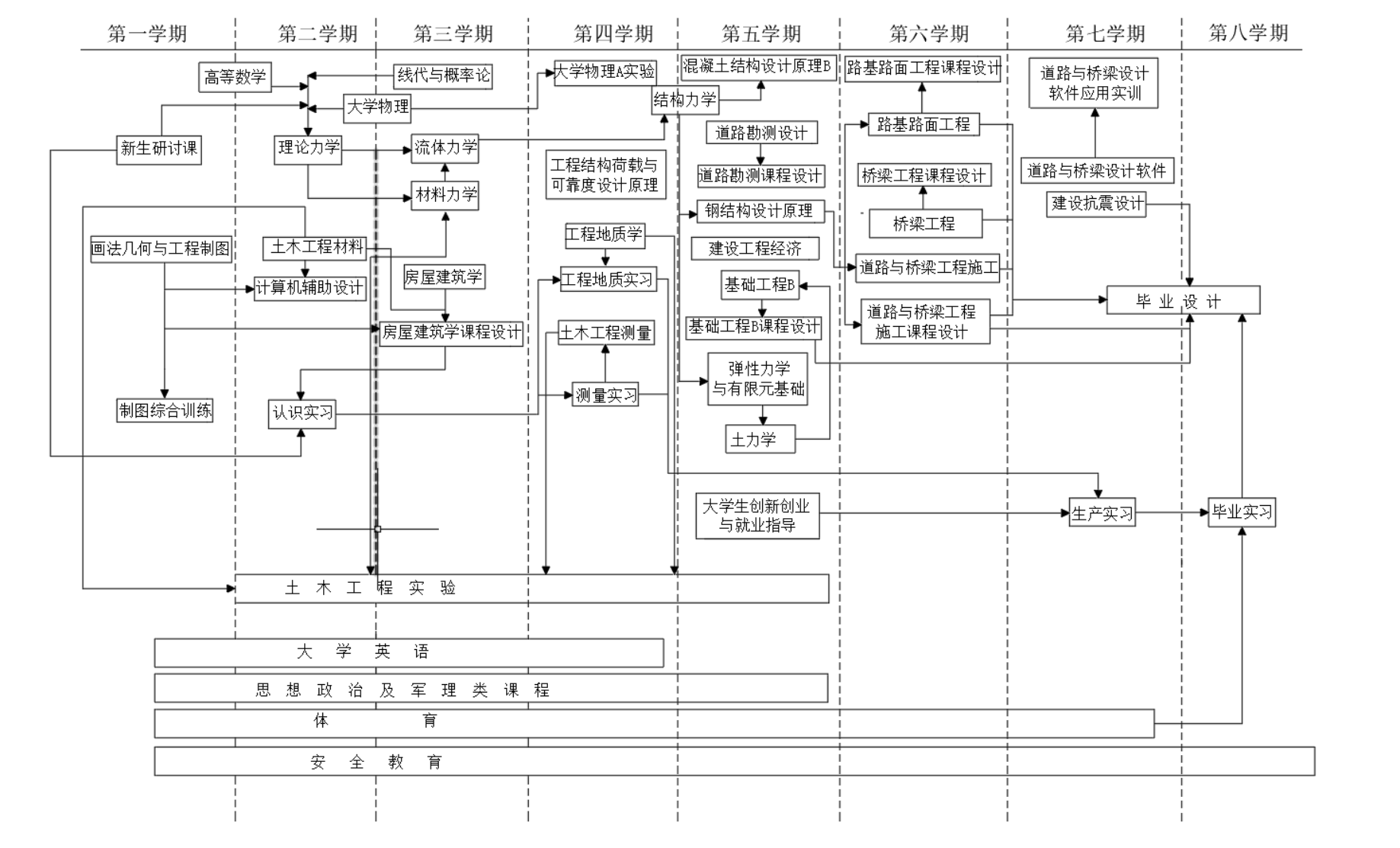 制图综合训练、认识实习、测量实习、工程地质实习、生产实习(暑期)、混凝土结构楼盖课程设计、钢结构课程设计、建筑工程施工课程设计、基础工程课程设计、桥梁工程课程设计、路基路面工程课程设计、道路与桥梁工程施工课程设计、毕业论文(设计)和毕业实习。