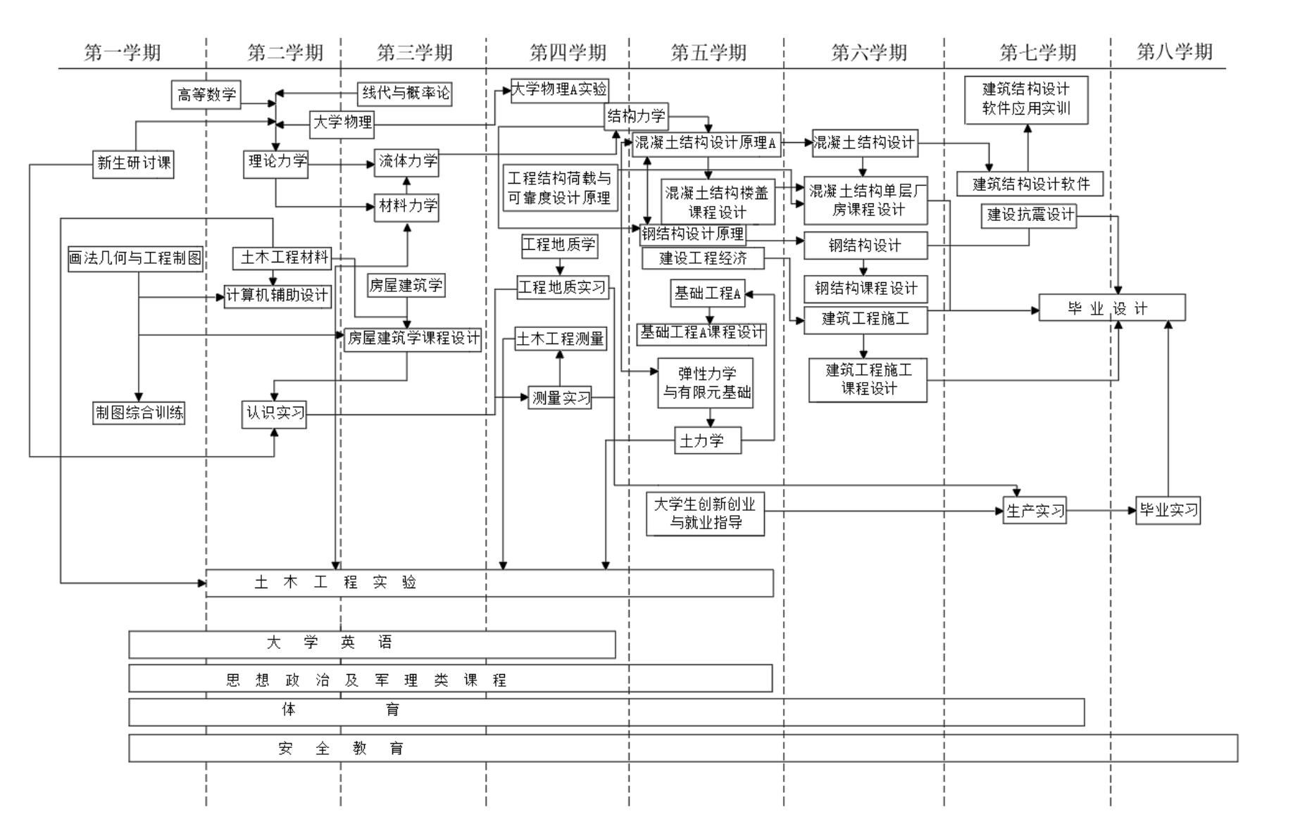 《新生研讨课(土木工程概论)》、《画法几何与工程制图》、《理论力学》、《材料力学》、《流体力学》、《结构力学》、《工程结构荷载与可靠度设计原理》、《土木工程材料》、《土木工程测量》、《土力学》、《混凝土结构设计原理》、《钢结构设计原理》、《工程地质》、《基础工程》、《建设工程经济》、《建筑工程施工》和《道路与桥梁工程施工》。