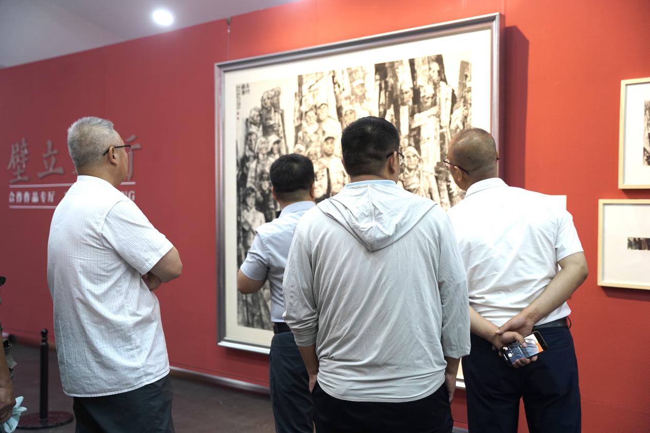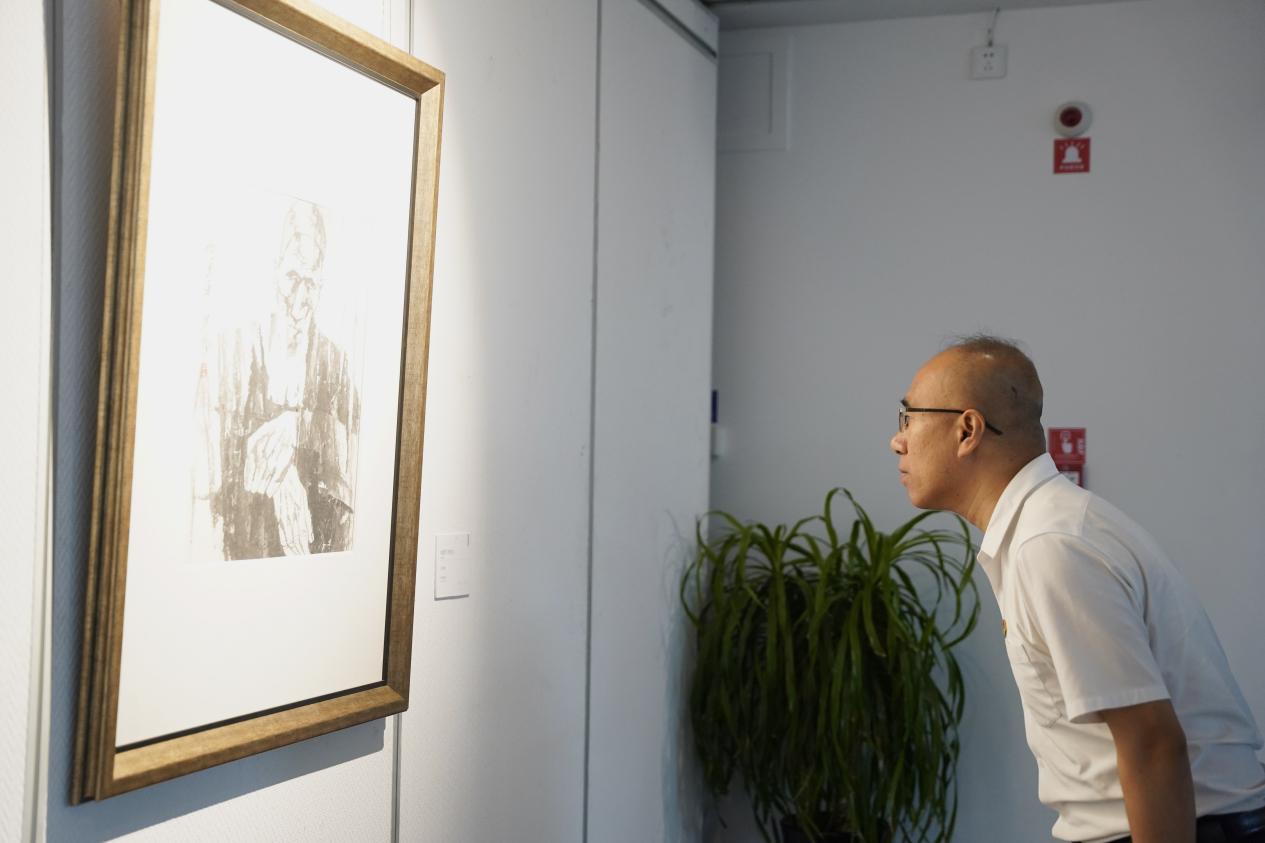 三楼5展厅(火花的锤炼)、7展厅(力群版画美术展),以革命历史为时间线,体悟近代山西“创作木刻”版画所蕴藏的民族精神;最后到达四楼9号(壁立太行)、10号(舟行万里)展厅,宏幅巨制的画卷再现了革命战争历史,中西结合的艺术风格彰显着两位艺术家深厚的艺术功底和对传统文化的热忱。师生党员们沉浸在艺术的世界里,感受着笔墨丹青所绘制的时代画卷和红色精神的传承,对两位艺术家的作品和创作精神表示了高度的赞赏和敬意。