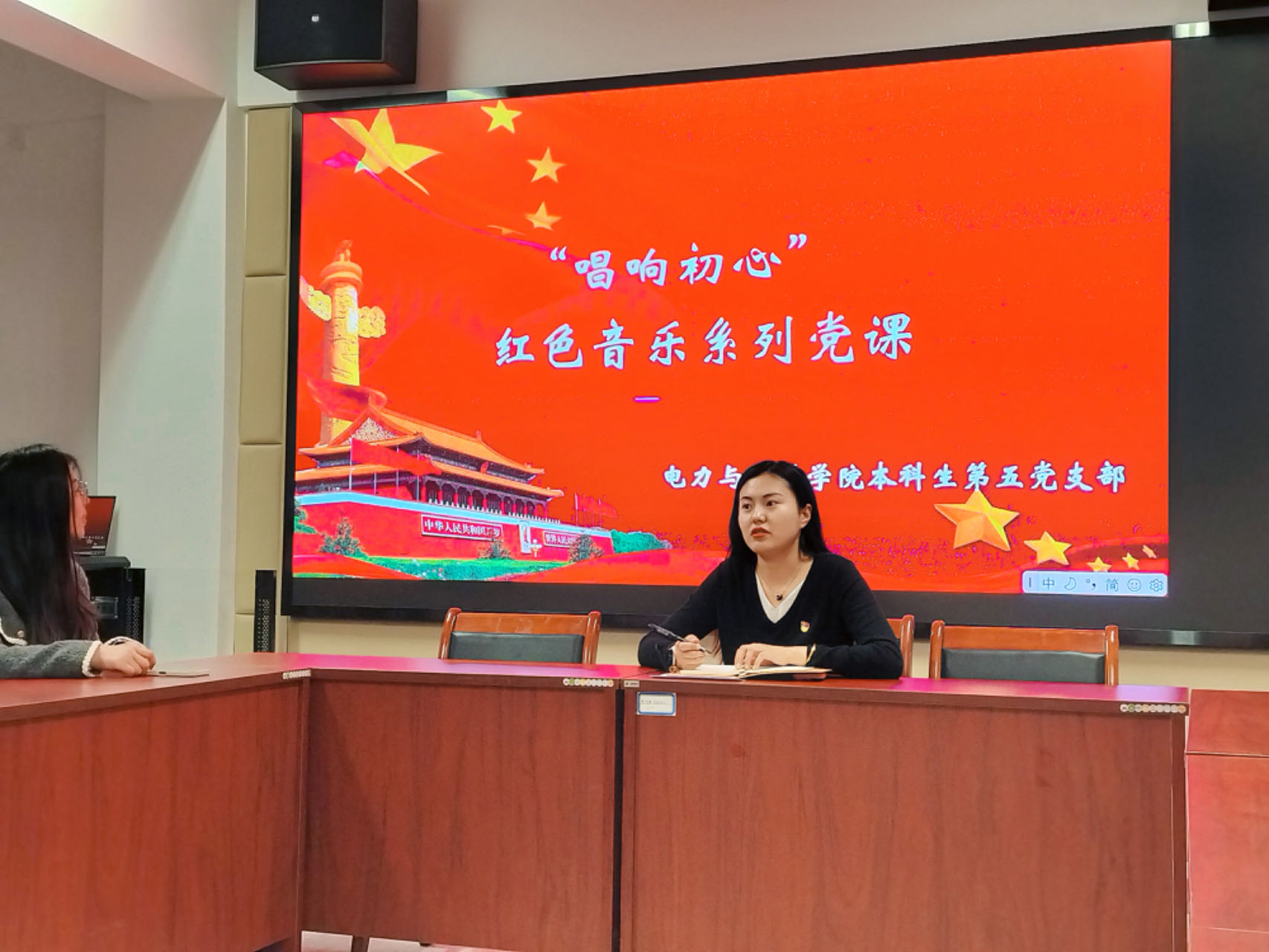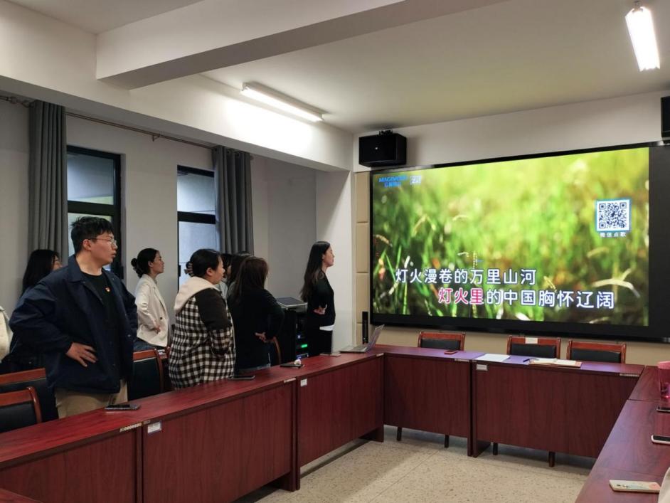 2024年4月2日下午,“唱响初心”红色音乐系列党课第一期在弘毅·学生社区党员活动室开讲。本期重温学习的音乐经典是《灯火里的中国》,由支部书记李莞舒领唱领学,支部全体党员参加。