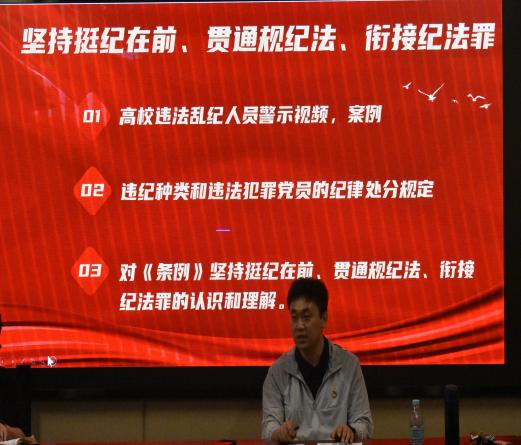 支部书记董杰围绕《中国共产党纪律处分条例》坚持挺纪在前、贯通规纪法、衔接纪法罪进行讲解分享。他希望大家作为青年学生党员要时刻牢记党的纪律要求,将党的纪律挺在学习生活成长之前,自觉遵纪守法,做到自我管理和自我约束,通过扎扎实实学习贯彻《中国共产党纪律处分条例》,树起日常言行的衡量标尺,不断用党规党纪校正思想和行动,不断增强纪律意识、提高党性修养。