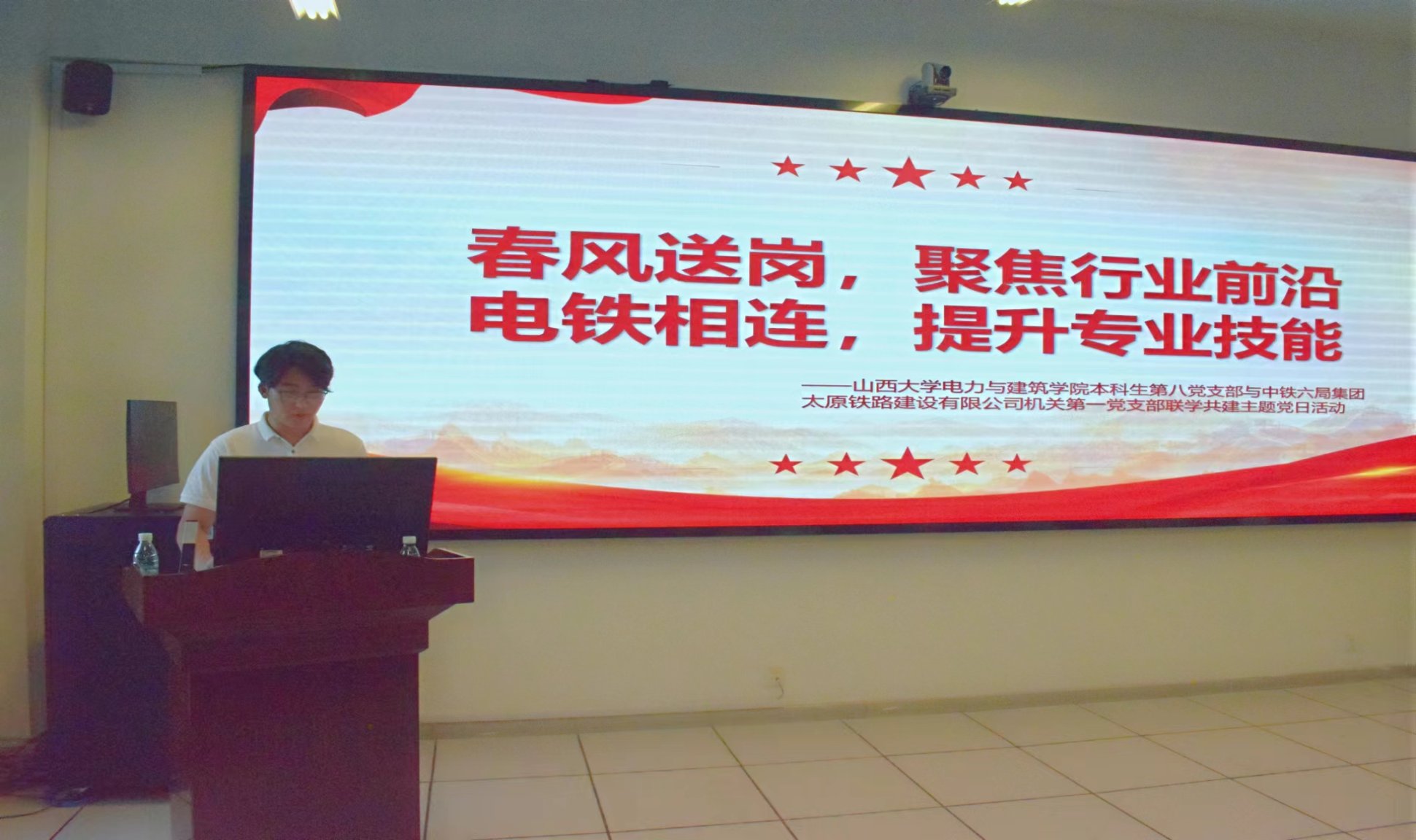 6月7日下午,在致远楼C座409会议室,学院本科生第八党支部与中铁六局集团太原铁路建设有限公司机关第一党支部共同开展联创共建主题党日活动。本次活动的主题是“春风送岗,聚焦行业前沿,电铁相连,提升专业技能”。太原铁路建设有限公司党委副书记、纪委书记、工会主席鹿林,人力资源部(党委干部部)部长兼机关第一党支部书记田立明,企业发展部部长王智(校友代表),党建工作部副部长马占洲,151amjs澳金沙门党委副书记尚王海,负责联系八支部的党委委员刘宏,本科生第八党支部书记兼就业办主任高山及本科生第八党支部党员代表,共计40余人参加了活动,活动由本科生第八党支部学生党员谷铜林主持。