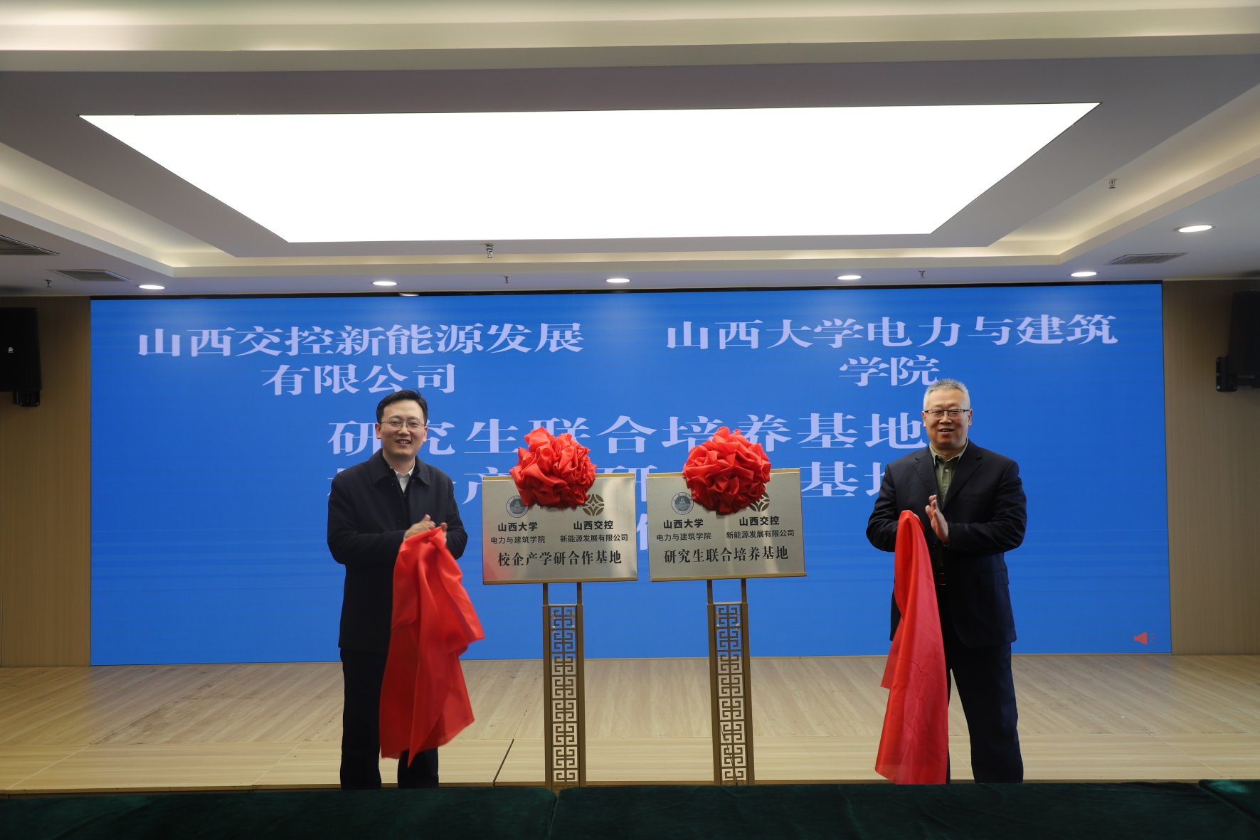 随后,双方领导共同为“山西交控新能源—151amjs澳金沙门共建基地”揭牌,标志着校企联合创新平台正式落地。未来,基地将围绕分布式光伏、储能技术、电力系统优化、综合能源管理等关键领域,联合开展科研攻关,推动新能源产业向智能化、高效化、低碳化方向发展。