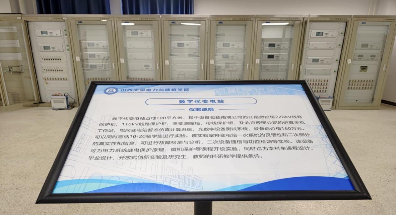数字化变电站实验室占地70.56平方米,其中设备包括南瑞公司的公用测控柜、220kV线路保护柜、110kV线路保护柜、主变测控柜、母线保护柜,及北京殷图公司的仿真主机工作站、电网变电站暂态仿真计算系统、光数字设备测试系统,设备总价值160万元。可以同时容纳10-20名学生进行实验。该实验室将变电站一次系统的灵活性和二次部分的真实性相结合,可进行故障检测与分析,二次设备通信与功能检测等实验。该实验室可为电力系统继电保护原理、微机保护等课程开设实验,同时也为本科生课程设计、毕业设计、开放式创新实验及研究生、教师的科研教学提供了充足条件。
