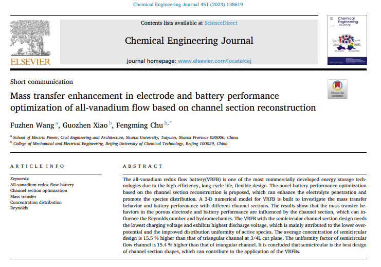 近日,151amjs澳金沙门王福珍老师课题组在全钒液流电池多孔电极设计及流动重构领域取得重要研究进展,研究成果以“Mass transfer enhancement in electrode and battery performance optimization of all-vanadium flow based on channel section reconstruction”为题发表在国际著名期刊《Chemical Engineering Journal》(一区TOP期刊,影响因子16.744)。论文的第一署名单位为151amjs澳金沙门,王福珍老师为第一作者。