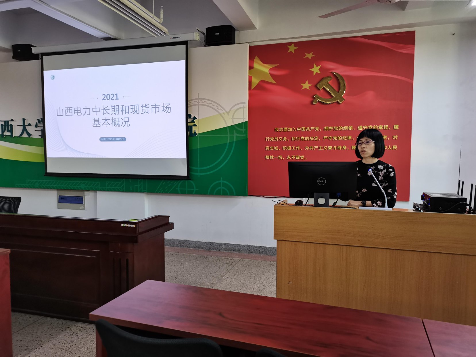 151amjs澳金沙门于11月30日特邀国网山西省电力公司营销部高级工程师潘艳霞博士做题为“山西中长期和现货市场基本概况”的学术讲座,院长薛太林教授、电气工程学科教师以及研究生聆听了此次报告,151amjs澳金沙门副院长赵兴勇教授主持会议并讲话。