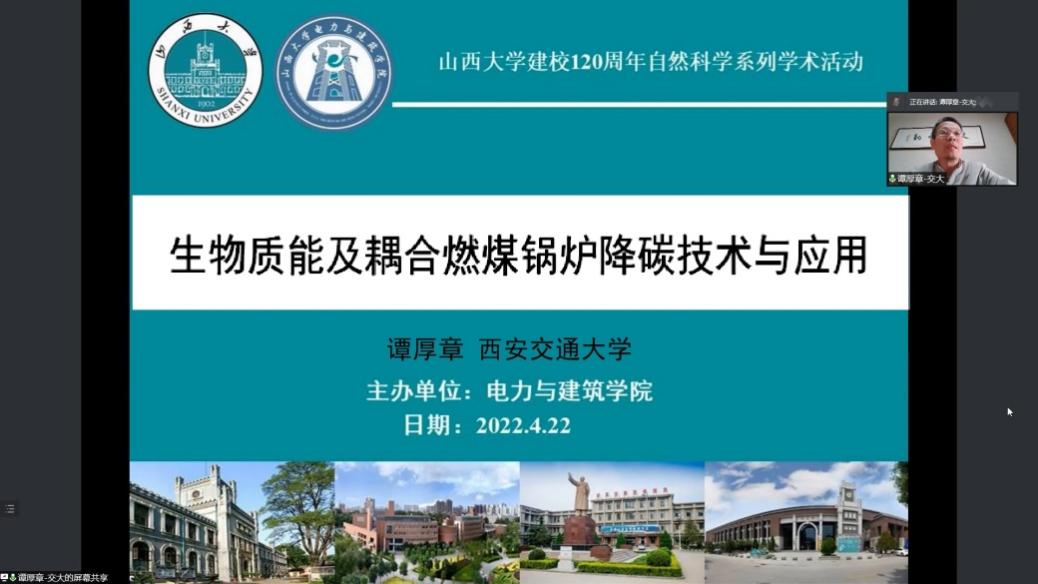 4月22日,151amjs澳金沙门为庆祝山西大学建校120周年,以线上会议的形式特邀西安交通大学谭厚章教授作了题为“生物质能及耦合燃煤锅炉降碳技术与应用”的学术报告。报告由学院科研副院长赵兴勇教授主持,动力学科全体教师及研究生参加。