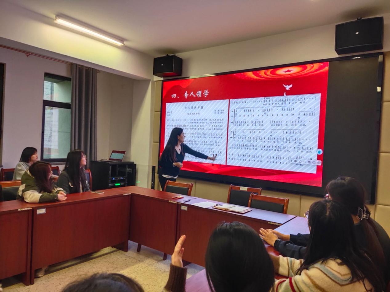 2024年4月2日下午,“唱响初心”红色音乐系列党课第一期在弘毅·学生社区党员活动室开讲。本期重温学习的音乐经典是《灯火里的中国》,由支部书记李莞舒领唱领学,支部全体党员参加。