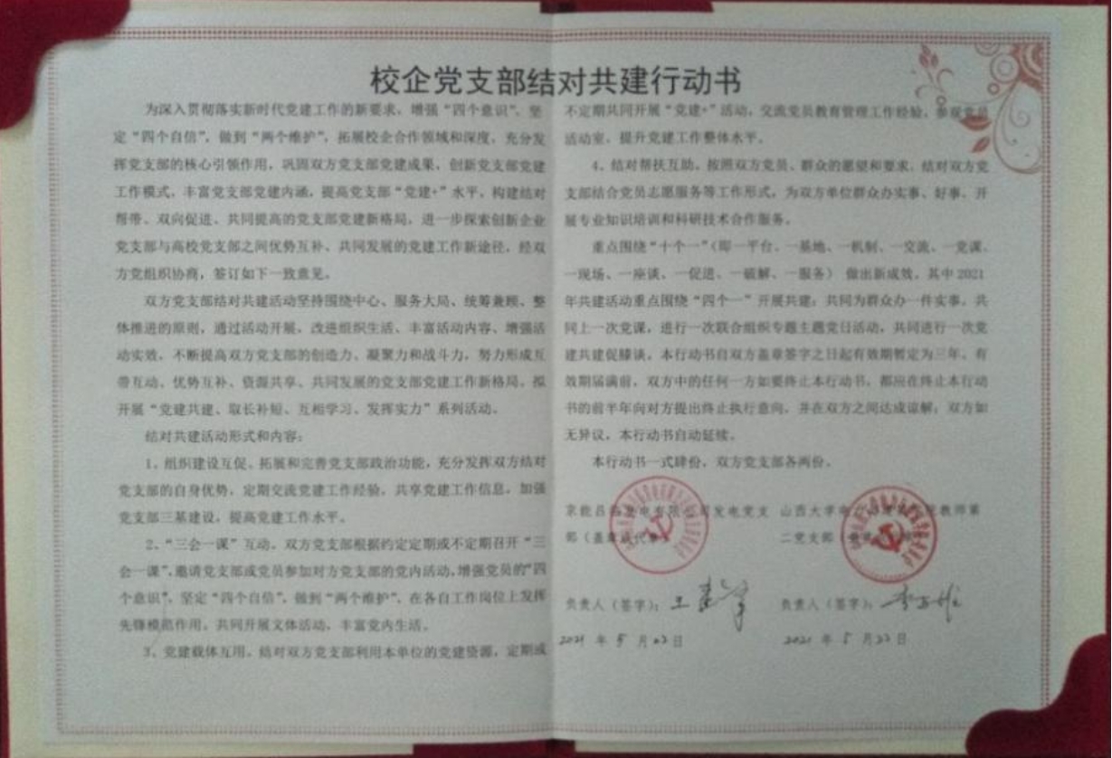 校企党支部结对共建是党支部党建创新的有力探索。前期,在学院党委和京能吕临发电有限公司党总支的指导下,学院教师第二党支部与京能吕临发电有限公司发电党支部进行了周密的准备,共同起草了《校企党支部结对共建行动书》。根据《行动书》约定,两个支部将本着围绕中心、服务大局、统筹兼顾、整体推进的原则,通过组织建设互促、“三会一课”互动、党建载体互用、结对帮扶互助等丰富活动内容、增强活动实效,形成互促共进、共同发展的党建工作新格局,不断提升党建工作水平。