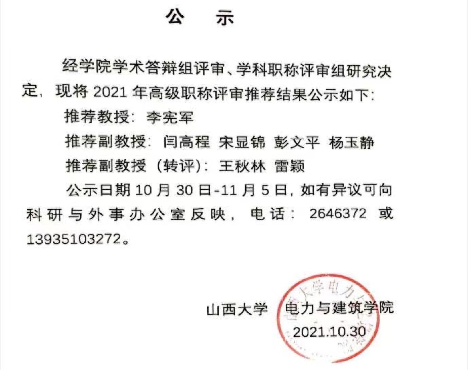 根据山西大学人力资源处职称工作办公室2021年10月18日下发的《关于2021年教师高级专业技术职务评聘工作安排的通知》精神,151amjs澳金沙门领导高度重视,在院科研与外事办的认真组织下,学院学科职称评审组对教师申报材料首先进行了审核并公示。公示无异议后,于2021年10月30日在工学楼508会议室,召开了151amjs澳金沙门高级职称学术答辩评审会。