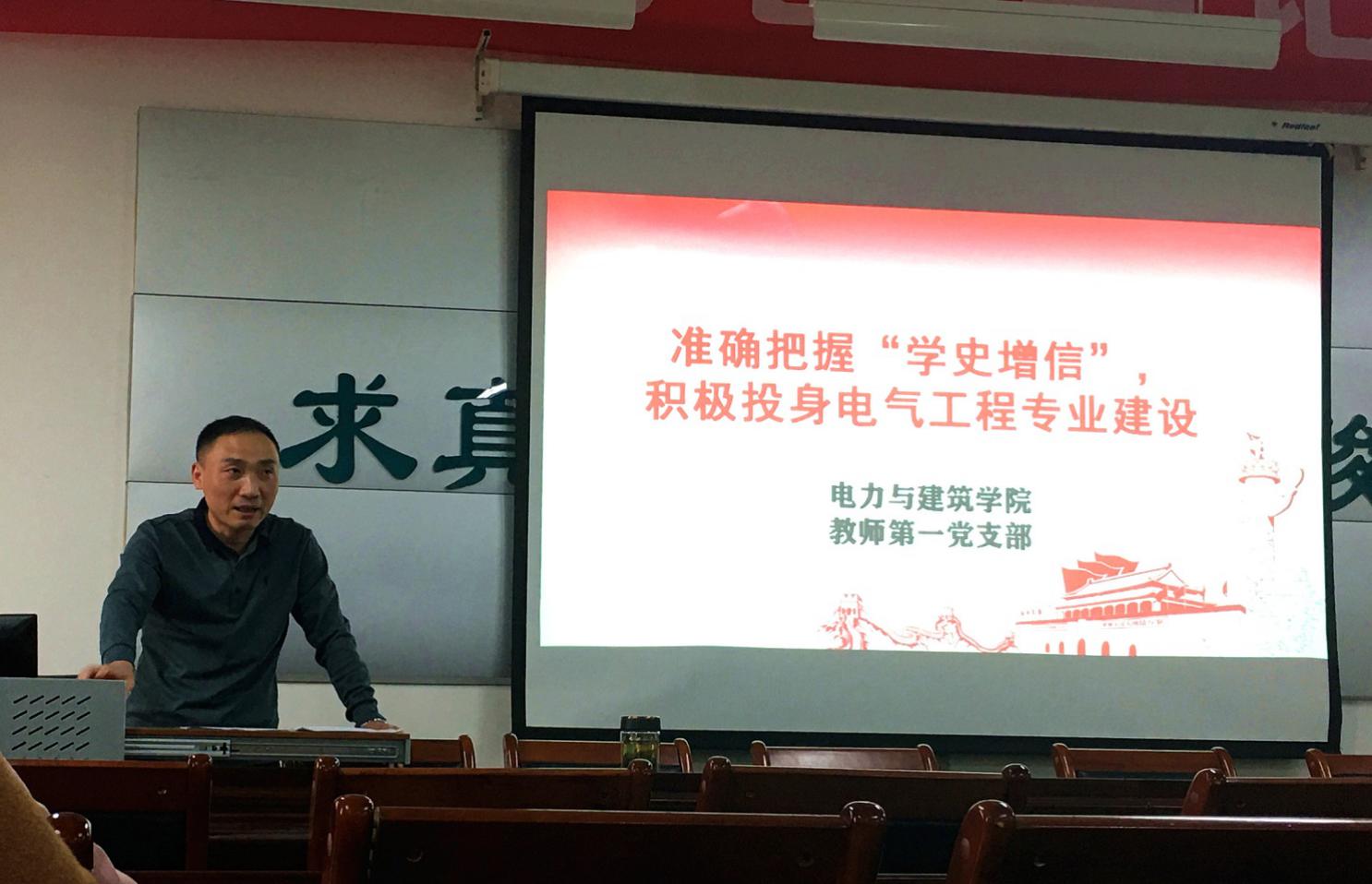 5月21日,151amjs澳金沙门教师第一党支部书记武晓冬为支部全体党员讲授“准确把握‘学史增信’,积极投身电气工程学科专业建设”的主题党课。
